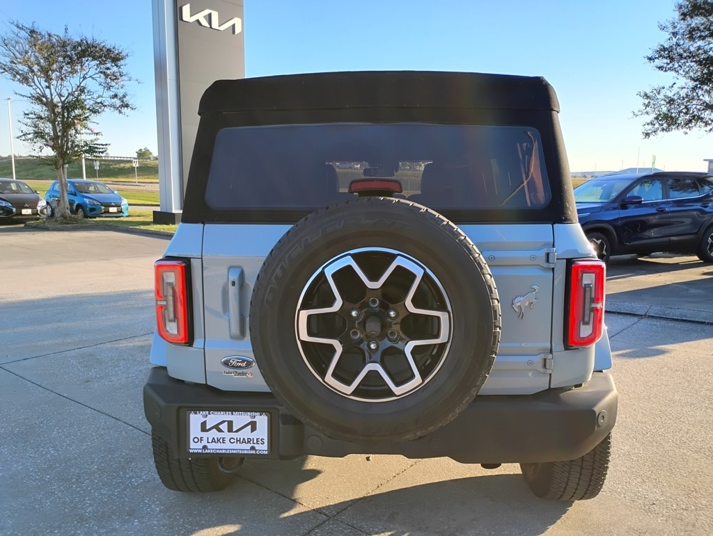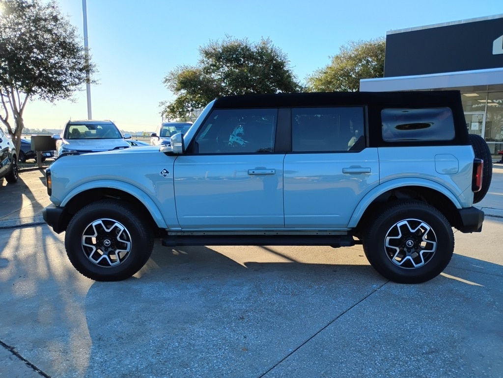 Equipment Group 313A High Package (12" LCD Capacitive Touchscreen w/Swipe Capability, 360-Degree Camera, Additional Sound Deadening, Front Parking Sensors, Information on Demand Panel, and Sideview Mirrors), Bronco Outer Banks Advanced, 4D Sport Utility, 2.7L EcoBoost V6, 10-Speed Automatic, 4WD, Eruption Green Metallic, 4-Wheel Disc Brakes, ABS brakes, Air Conditioning, Auto High-beam Headlights, Brake assist, Delay-off headlights, Dual front impact airbags, Dual front side impact airbags, Electronic Stability Control, Emergency communication system: 911 Assist, Front anti-roll bar, Front Center Armrest, Front wheel independent suspension, Fully automatic headlights, Integrated roll-over protection, Low tire pressure warning, Occupant sensing airbag, Overhead airbag, Panic alarm, Passenger door bin, Security system, SiriusXM Radio w/360L, SYNC 4, Traction control, 7 Speakers, AM/FM radio: SiriusXM with 360L, AM/FM Stereo, Compass, Driver door bin, Driver vanity mirror, Exterior Parking Camera Rear, Front Bucket Seats, Front reading lights, Heated door mirrors, Illuminated entry, Outside temperature display, Overhead console, Passenger vanity mirror, Power door mirrors, Power steering, Power windows, Radio data system, Remote keyless entry, Speed control, Split folding rear seat, Steering wheel mounted audio controls, Tachometer, Telescoping steering wheel, Tilt steering wheel, Trip computer, and Variably intermittent wipers.